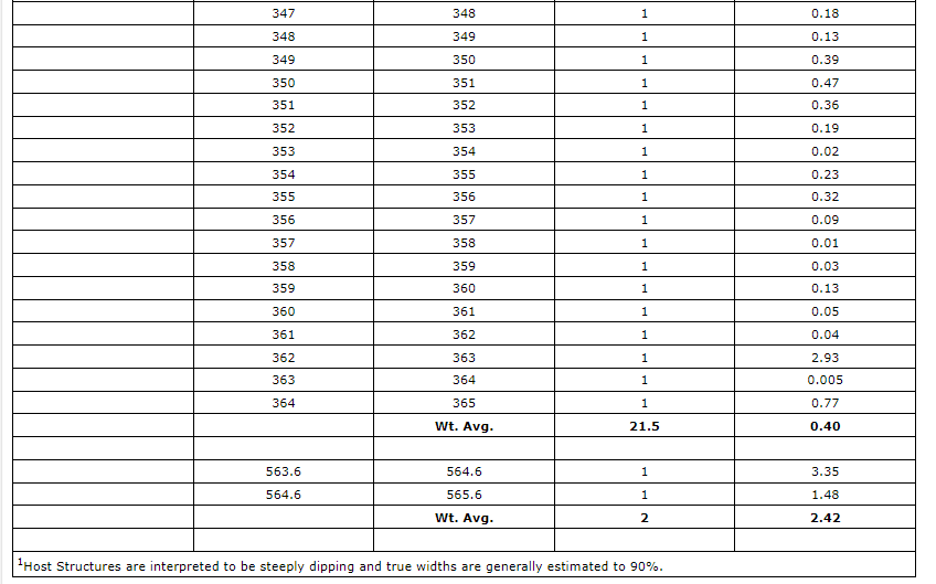 - Some lower-grade broad zones mantle higher-grade intercepts in the mafic volcanics. This usually occurs at the margin between mafic volcanics and QFP (low grade in both units surrounding a high-grade intercept).
