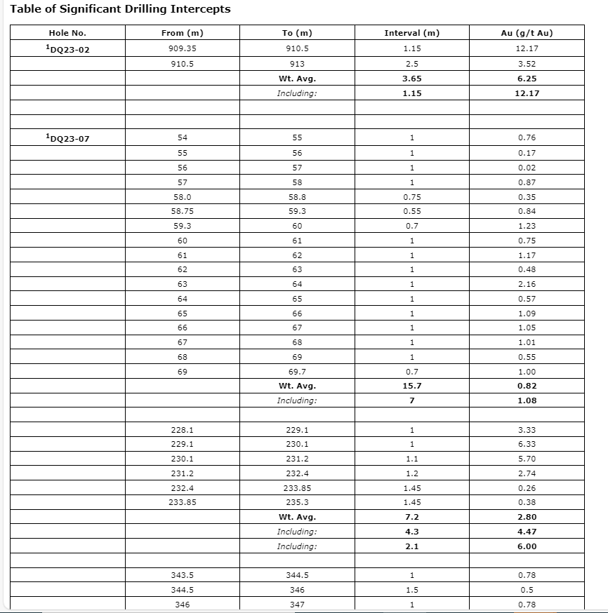 - DQ23-02 intersected 3.65 m of 6.25 g/t Au (including 1.2 m of 12.2 g/t Au). Expanded mineralization in footwall zone.