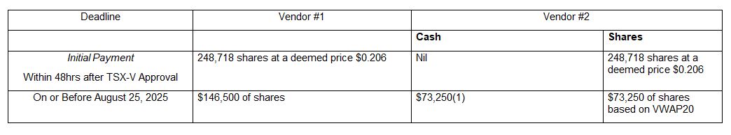 The initial payment comprised 248,718 common shares has been issued to each of the two vendors.