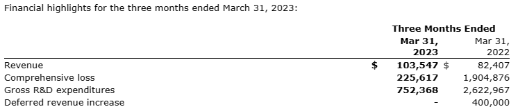 Total comprehensive loss for Q1 2023 was $300,000 compared with a comprehensive loss of $1.9-million for Q1 2022 and a comprehensive loss of $1.3-million for Q4 2022. Comprehensive loss in Q1 2023 and Q4 2022 was impacted by changes in value of the derivative financial instruments embedded within the convertible debenture. These fluctuations are driven primarily by the fluctuation in the company's share price. Additionally, R&D expenses were lower in Q1 2023 and Q4 2022 compared with Q1 2022 due to a lower level of operating activity on the RF XL pilot during the workover.