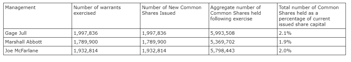 The Company's management have also exercised all warrants belonging to them as set out in the table below.