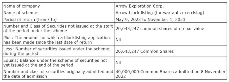 Arrow Exploration Corp. has provided the following update in accordance with Schedule Six of the AIM (Alternative Investment Market) Rules for Companies regarding its existing blocklisting arrangements.
