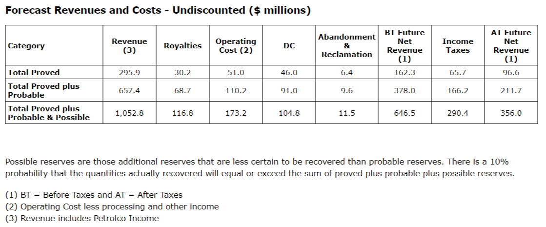 - Find and Develop cost of US$5.41/boe, US$2.42/boe, and US$1.61/boe for 1P, 2P, and 3P reserve categories, respectively;