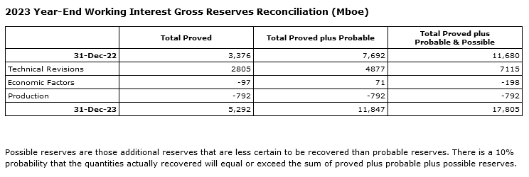 All reserves volume figures stated herein are on a working interest gross reserve basis. Currency amounts are in U.S. dollars (unless otherwise indicated) and comparisons are with Dec. 31, 2022.