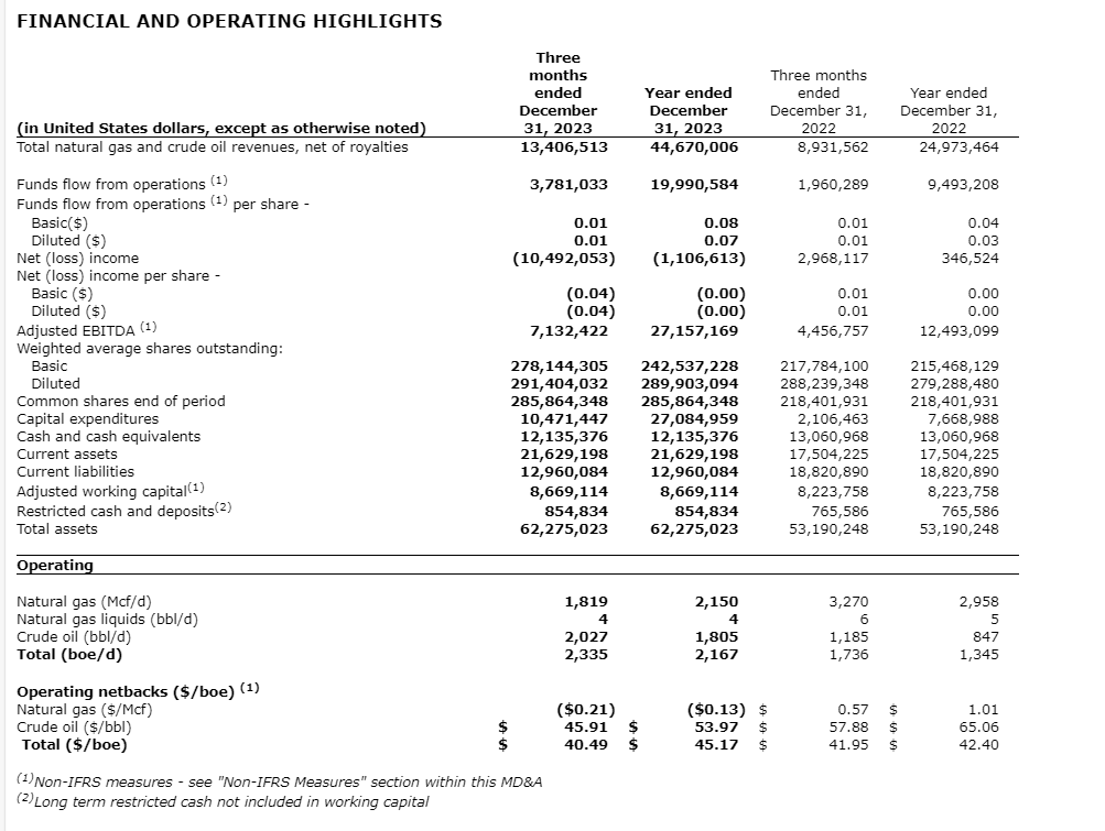 - Funds flow from operations of $19.9-million (FY 2022: $9.5-million) with Q4 2023 funds flow from operations of $3.8-million (FY 2022: $2-million).