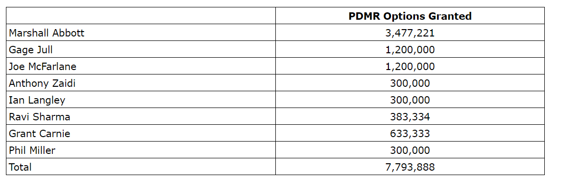 The company has granted 9,843,887 stock options to directors, executives and employees, pursuant to the company's stock option plan. The plan is intended to assist in attracting, retaining, engaging and rewarding directors, officers and employees of the company, provide additional incentive to these people for their efforts on behalf of the company, and align with the enhancement of shareholder value. Under the plan, the company is able to issue options to a maximum of 10 per cent of the number of issued and outstanding common shares in the company from time to time. The PDMRs (persons discharging managerial responsibilities) listed in an attached table have been granted the options.