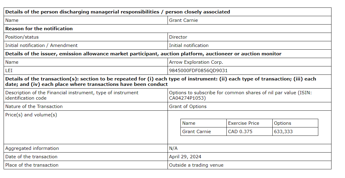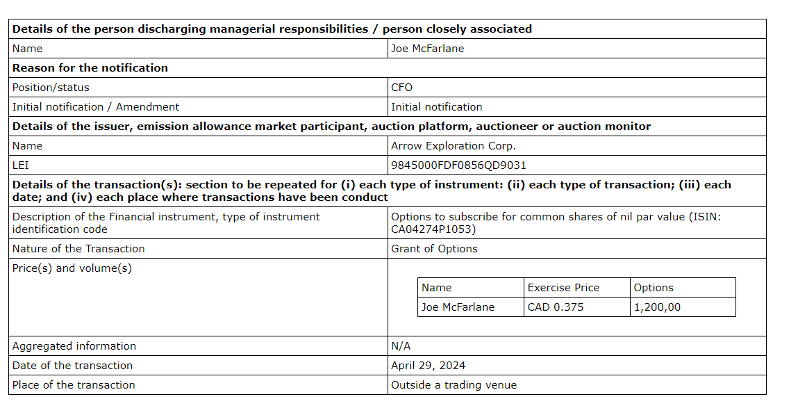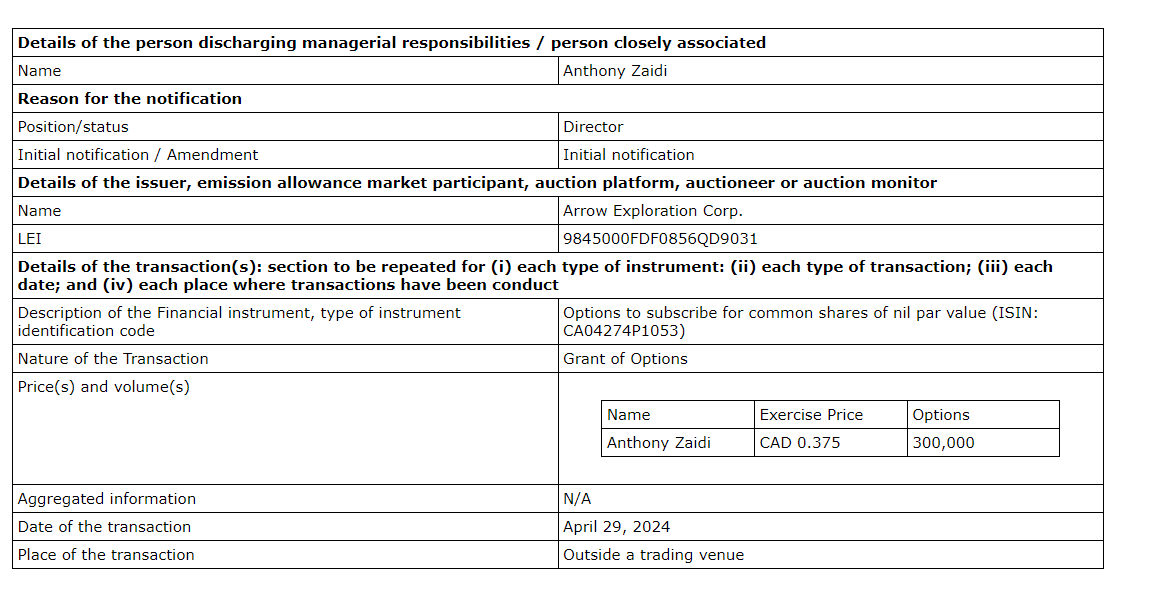 ARROW ANNOUNCES GRANT OF STOCK OPTIONS