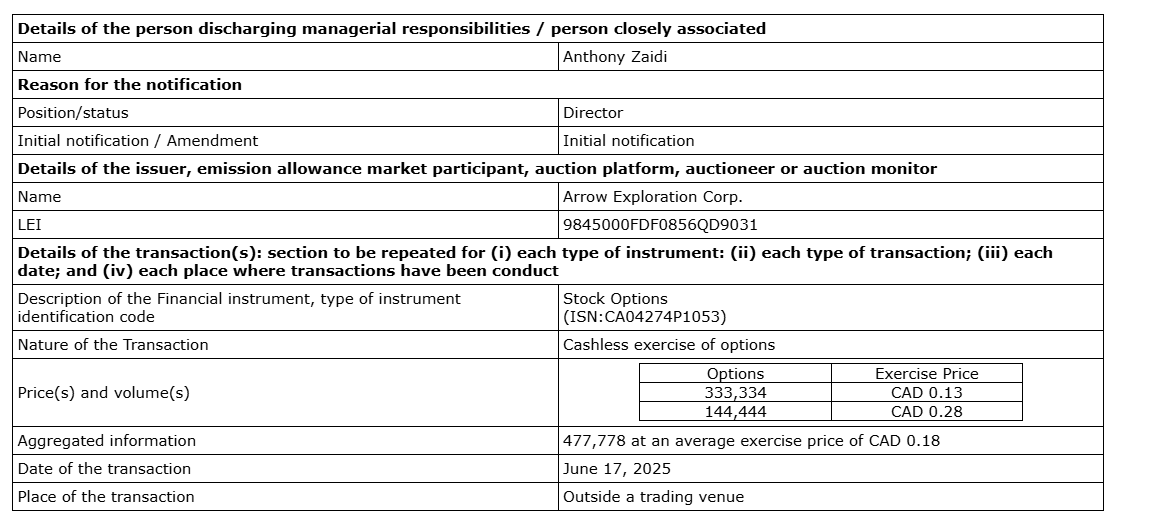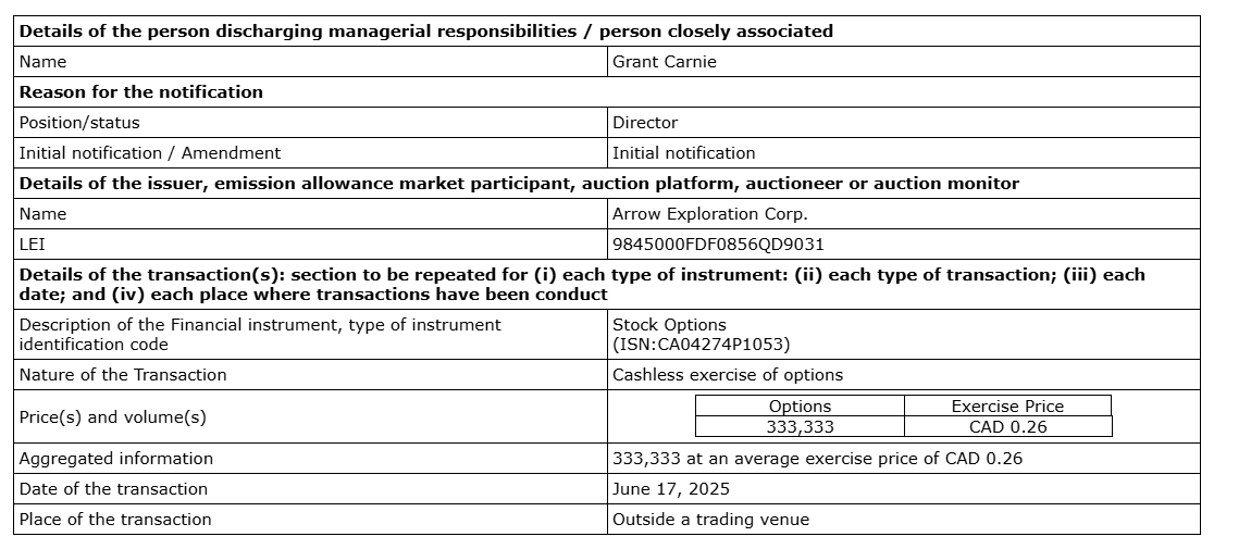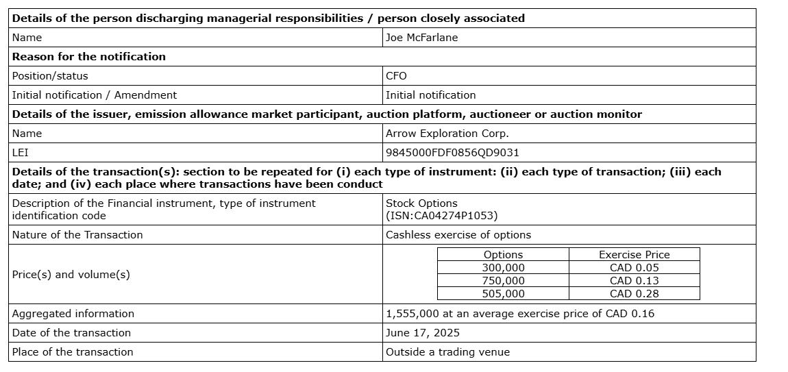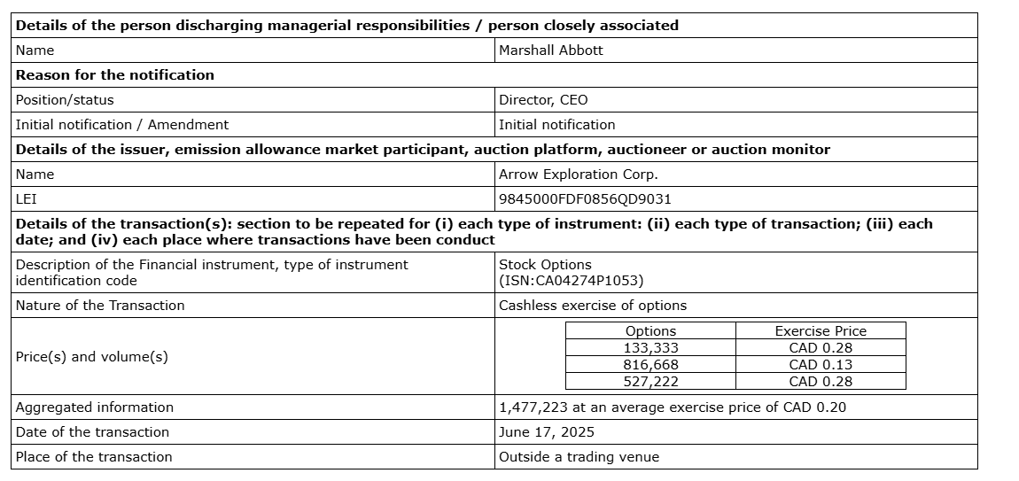 Certain Arrow Exploration Corp. directors and persons discharging managerial responsibilities (PDMRs) have exercised stock options. These options were exercised due to reaching their expiration date.