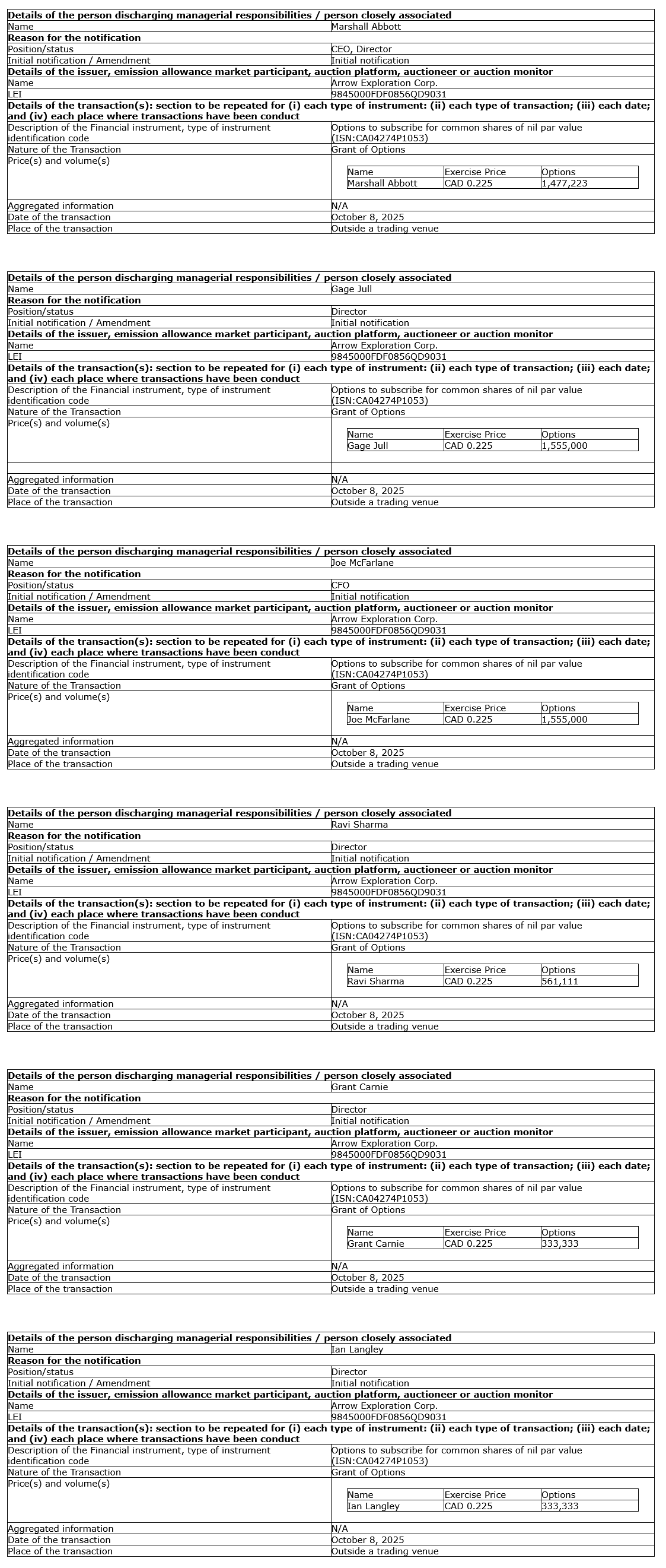 ARROW ANNOUNCES GRANT OF STOCK OPTIONS