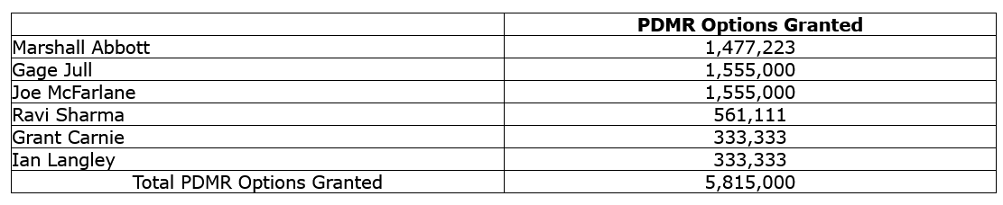 The company has granted 6,198,334 stock options to directors, officers and employees, pursuant to the company's stock option plan. The plan is intended to assist in attracting, retaining, engaging and rewarding directors, officers and employees of the company, provide additional incentive to these people for their efforts on behalf of the company, and align with the enhancement of shareholder value. The plan was reapproved by shareholders at the company's annual general meeting held on Sept. 24, 2025. Under the plan, the company is able to issue options to a maximum of 10 per cent of the number of issued and outstanding common shares in the company from time to time. The following PDMRs (persons discharging managerial responsibilities) have been granted the options listed below.