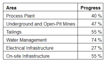 At quarter-end, construction of the tailing storage facility was progressing well and was 55 per cent complete. The two water storage basins were 74 per cent complete with only the lining installation remaining, in time before the rainy season. Other infrastructure, such as the camp, roads, workshops, and warehouses, were 55 per cent completed. Finally, the power line and electrical substations progressed to 27 per cent completion.