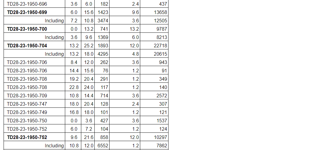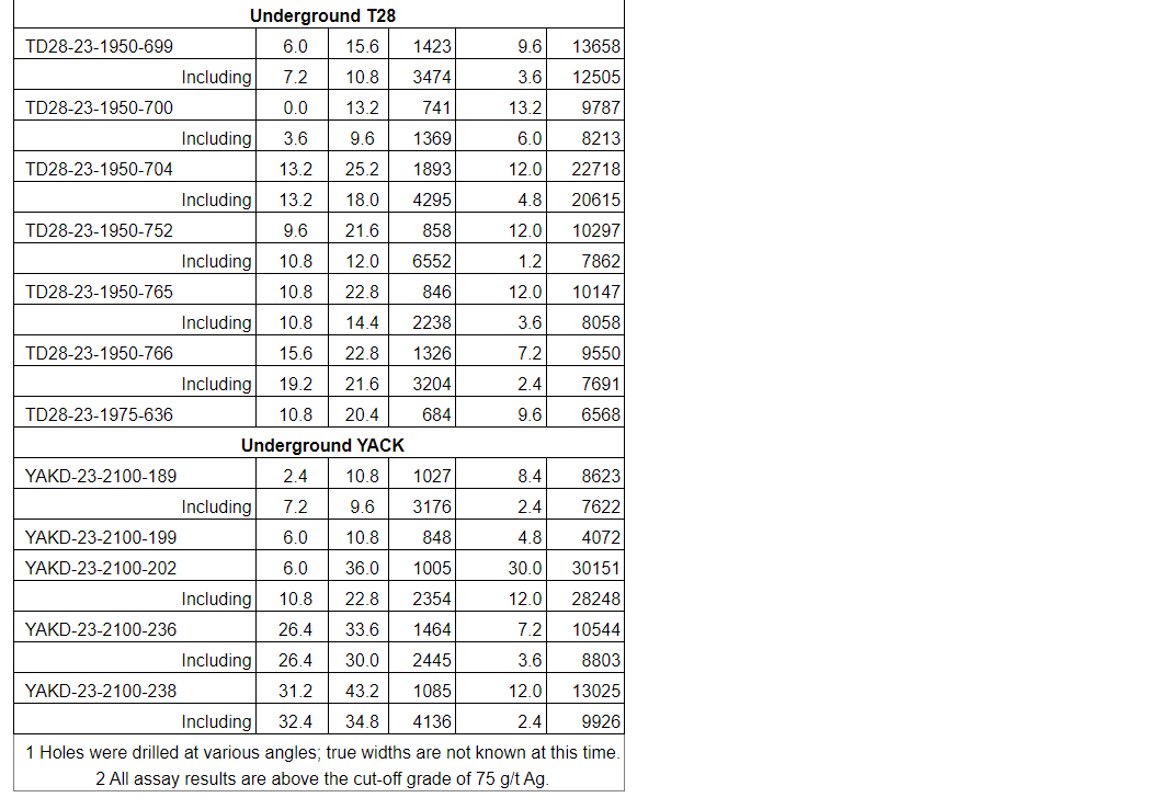 Hole TD28-23-1950-752 intercepted 858 g/t Ag over 12.0 m, including: