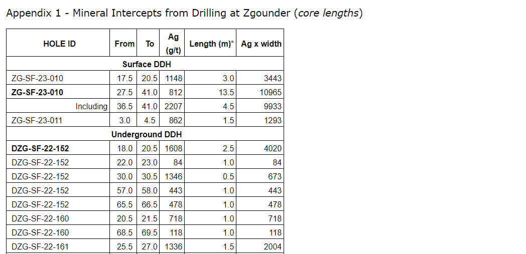 From surface in the western zone, hole ZG-SF-23-010 intercepted 812 g/t Ag over 13.5 m, including 2,207 g/t Ag over 4.5 m.