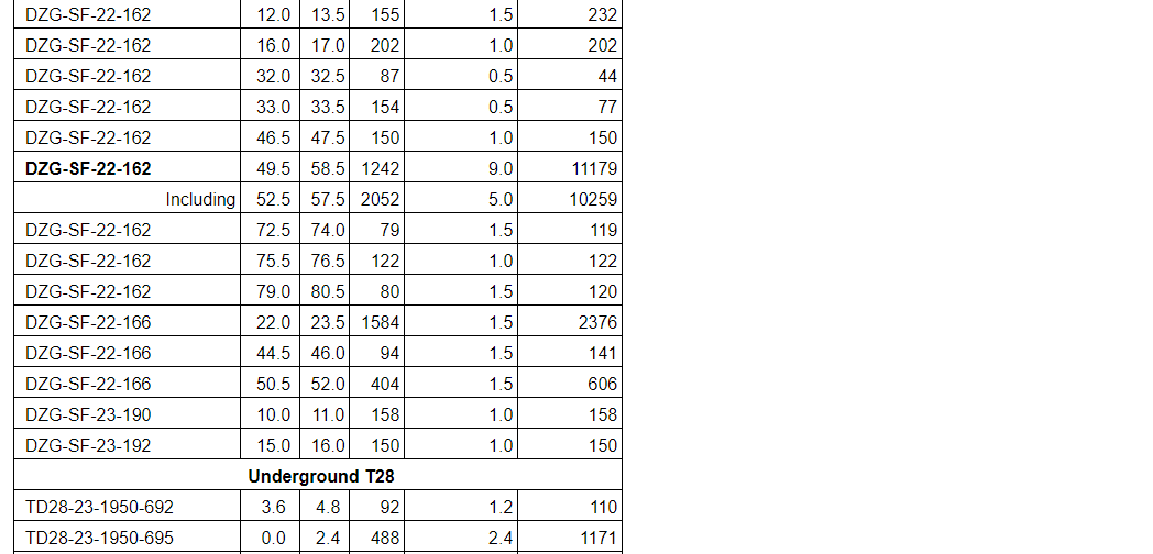 Diamond drill hole DZG-SF-22-162 intercepted 1,242 grams per tonne silver over 9.0 metres, including 2,052 g/t Ag over 5.0 m.