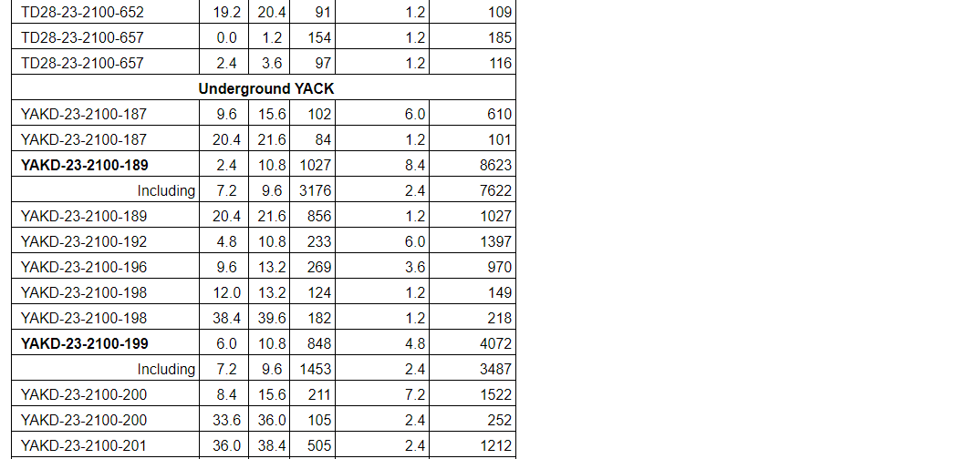In the central zone at the 2,100 m level, hole YAKD-23-2100-202 intercepted 1,005 g/t Ag over 30 m, including 2,354 g/t Ag over 12 m.