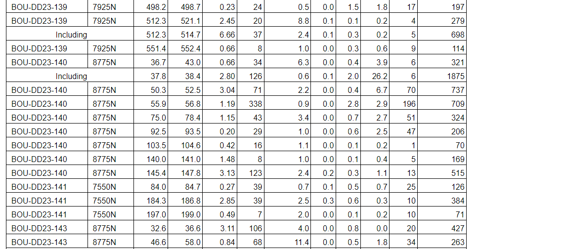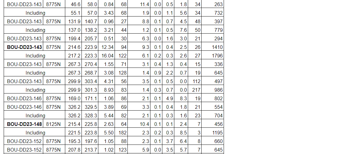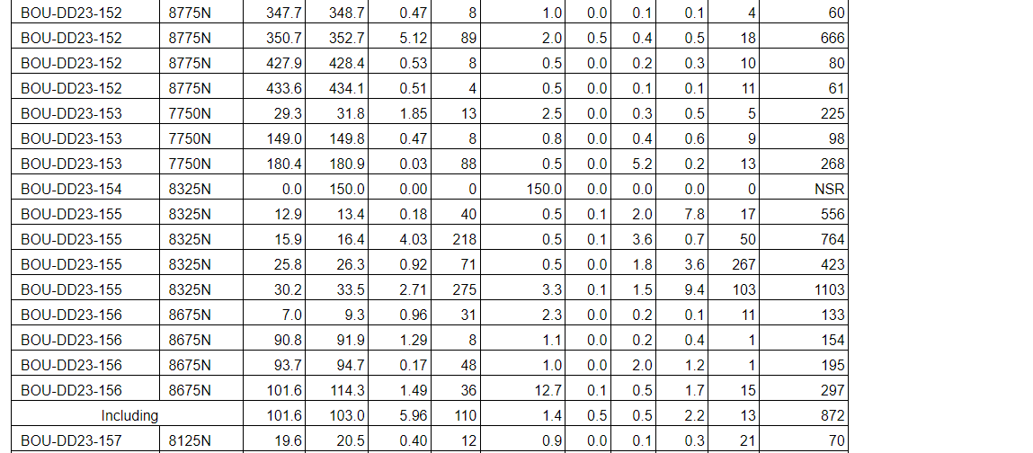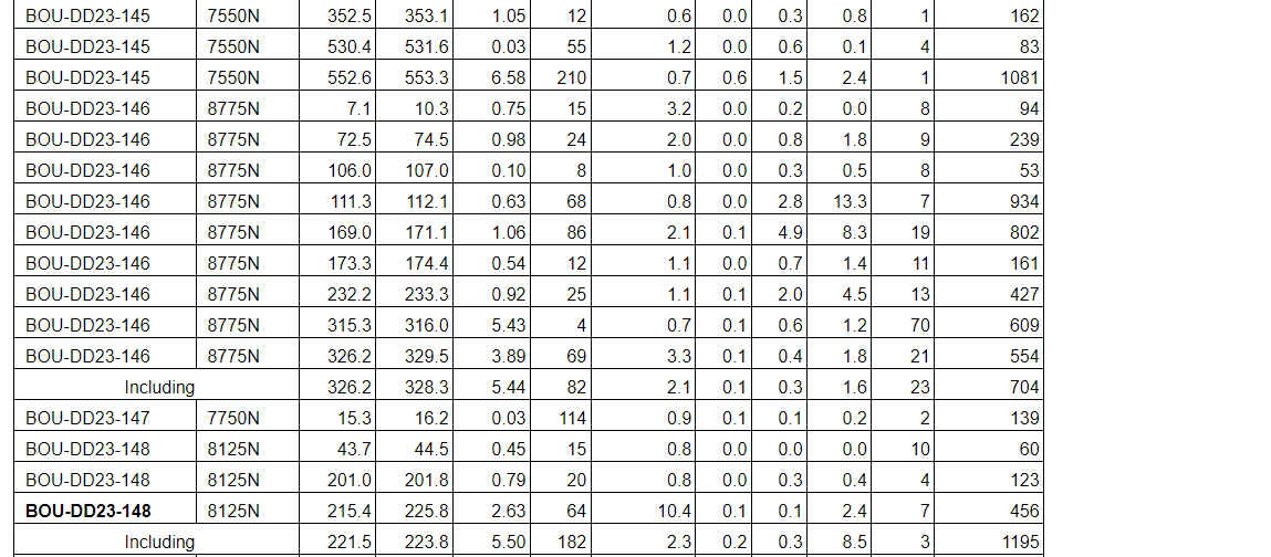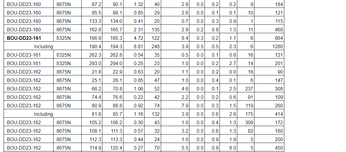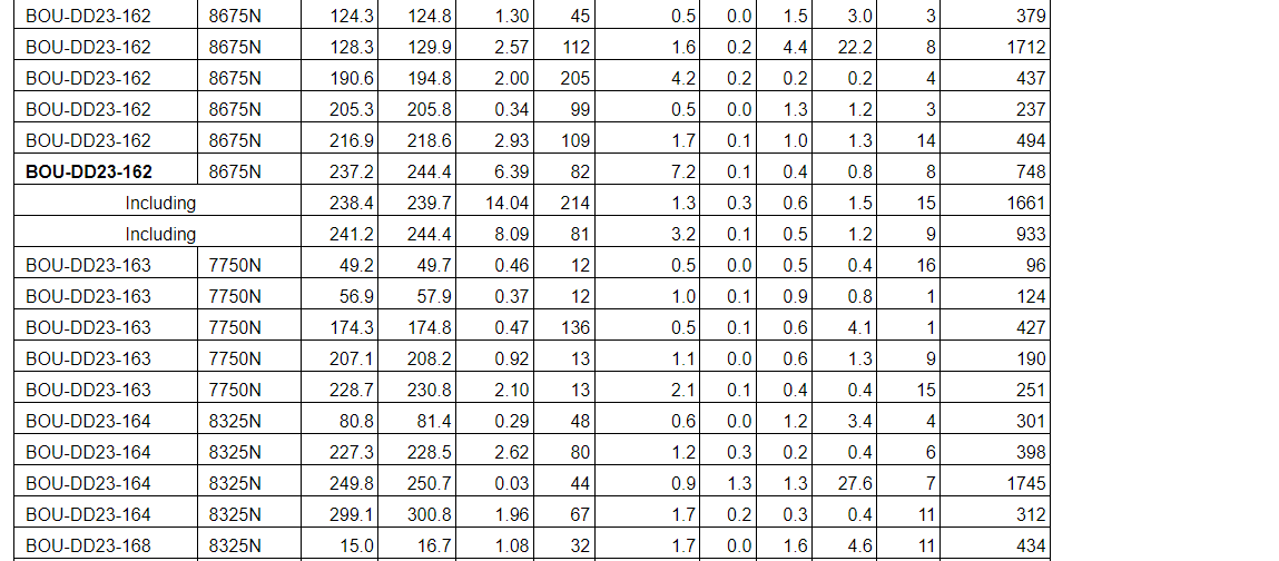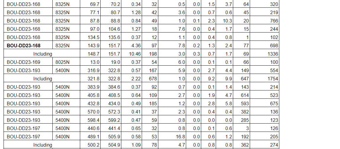 Drill results have been received for all drill holes up to BOU-DD23-164 with the addition of holes BOU-DD23-168, BOU-DD23-169, BOU-DD23-193 and BOU-DD23-197 (see an attached table).