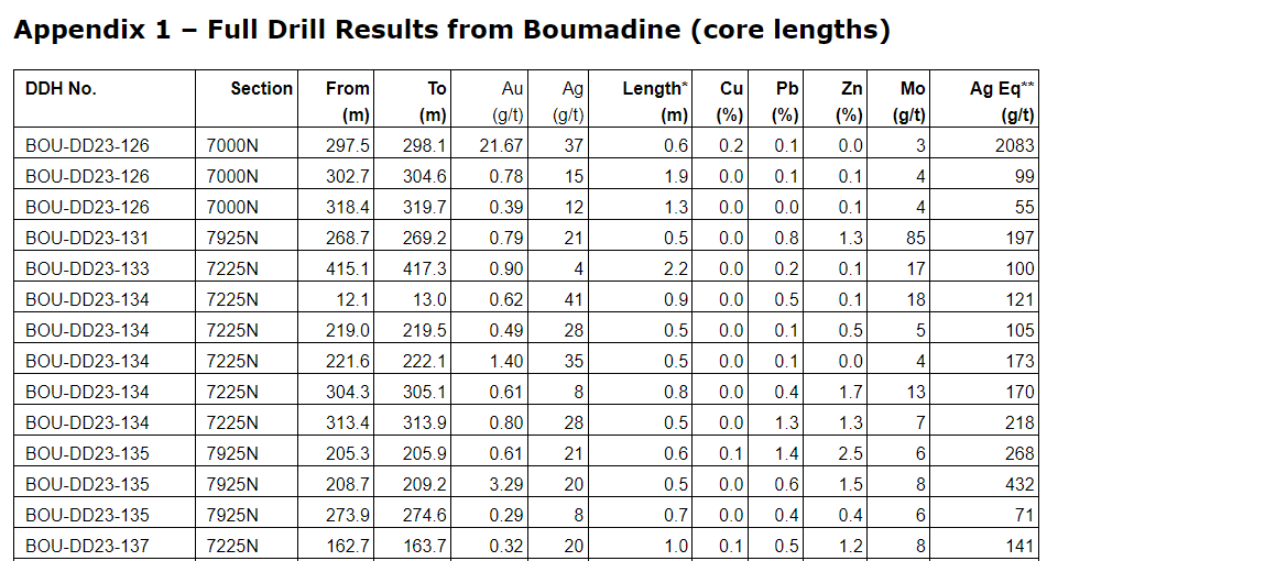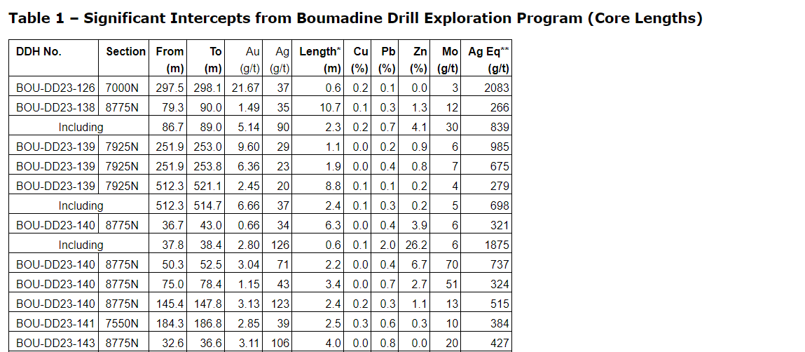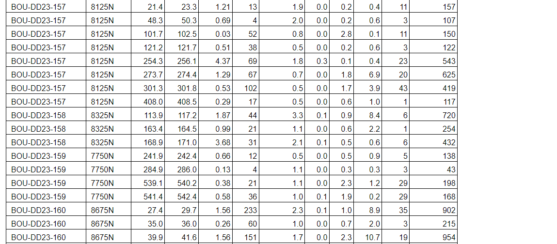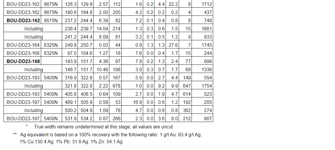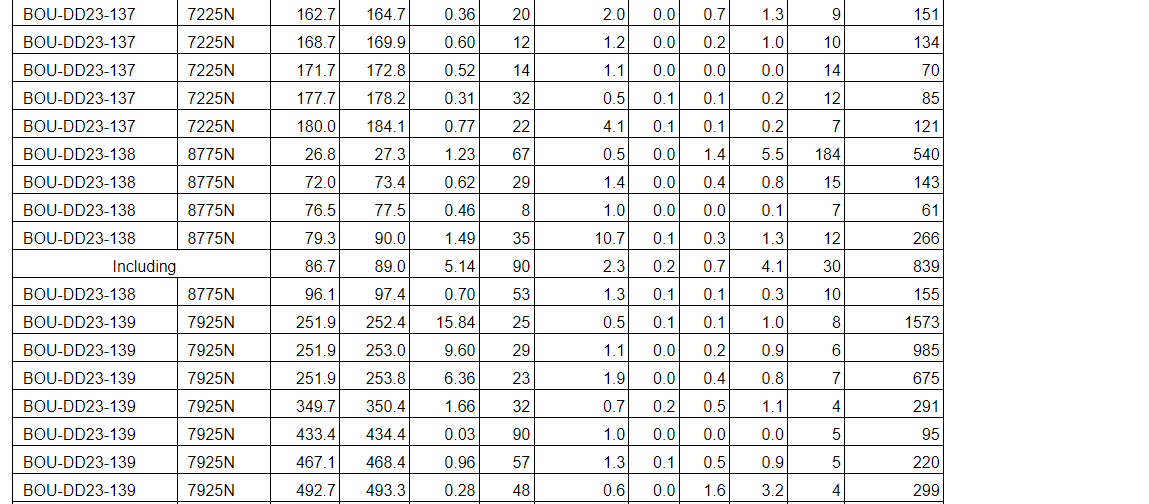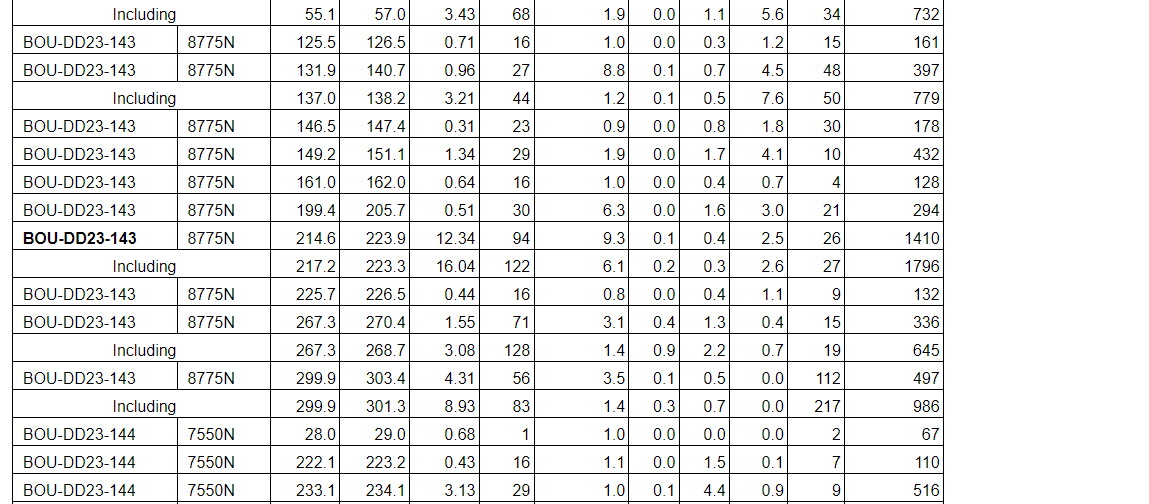 Drill results have been received for all drill holes up to BOU-DD23-164 with the addition of holes BOU-DD23-168, BOU-DD23-169, BOU-DD23-193 and BOU-DD23-197 (see an attached table).