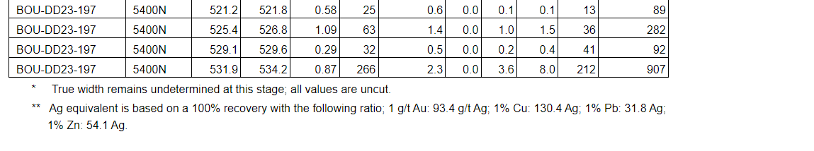 BOU-DD23-152 intersected 928 g/t AgEq over 5.9 m (7.42 g/t Au, 153 g/t Ag, 0.3 per cent Zn, 1.7 per cent Pb and 0.1 per cent Cu), including 4.9 m at 1,056 g/t AgEq.