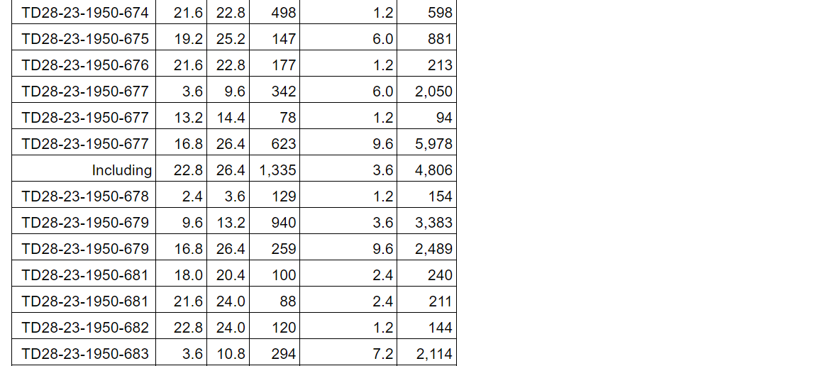 Hole TD28-23-1950-669 intercepted 933 g/t Ag over 9.6 m, including