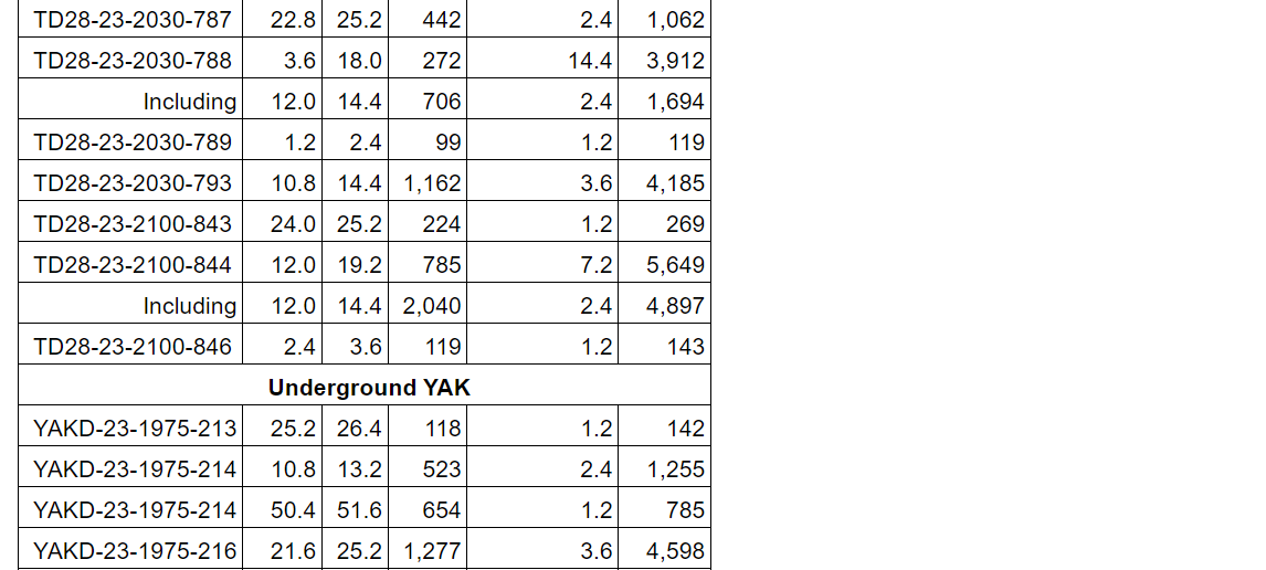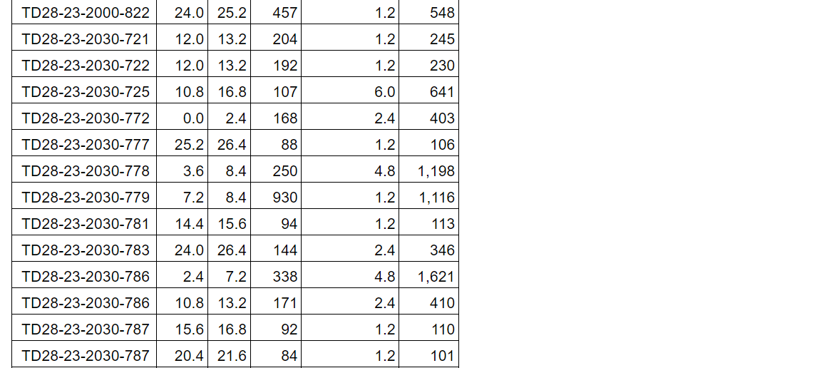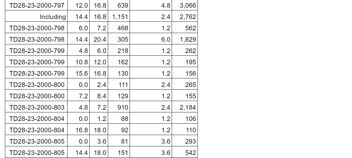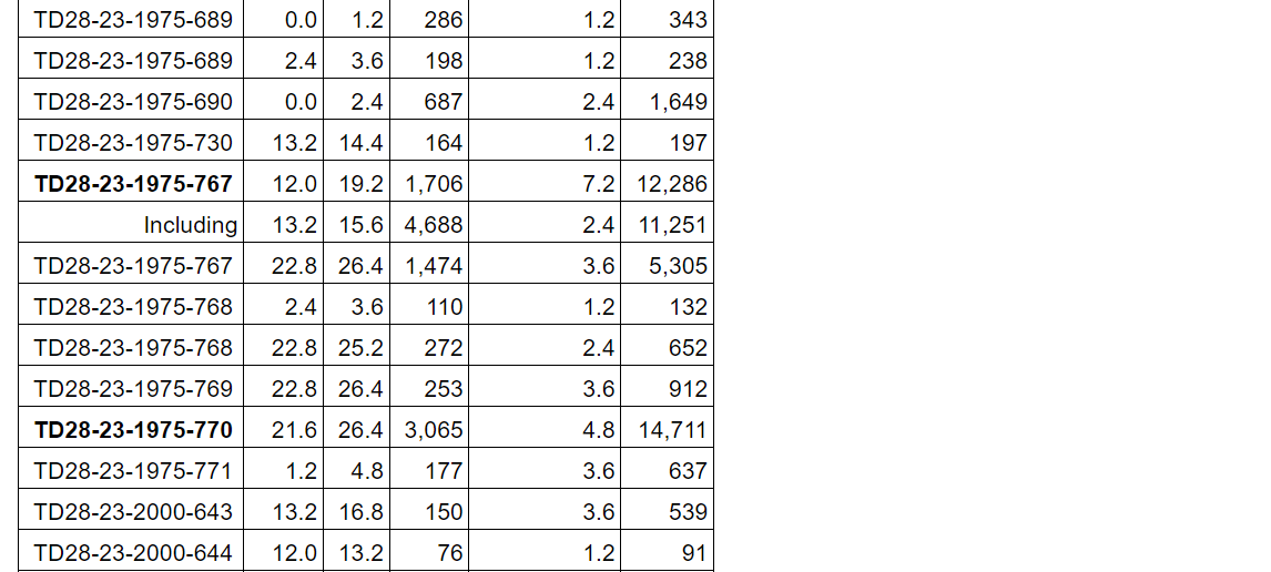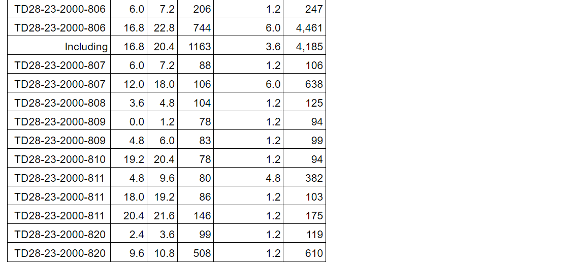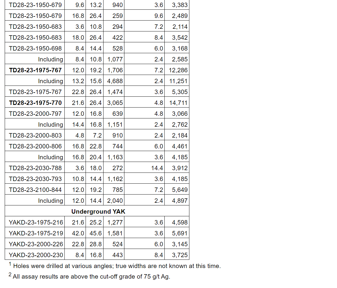 Hole TD28-23-1975-767 intercepted 1,706 g/t Ag over 7.2 m, including 4,688 g/t Ag over 2.4 m.