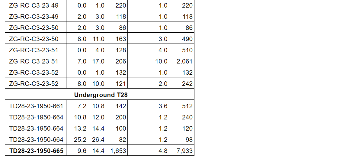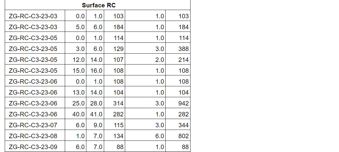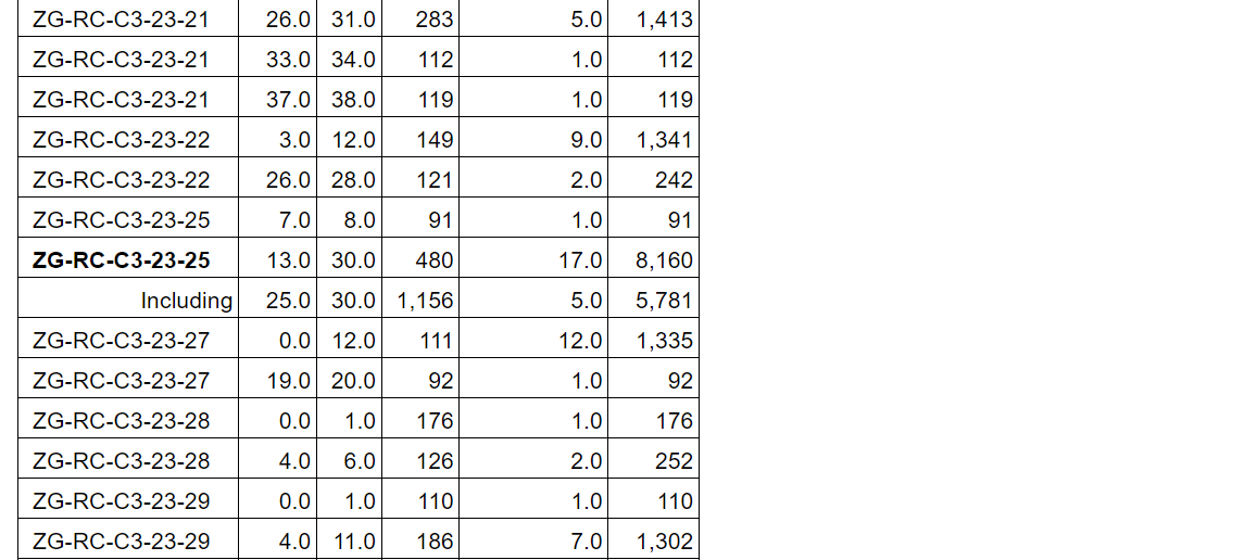 In the open-pit area to the east, reverse circulation (RC) drill hole ZG-RC-C3-23-25 intercepted 480 grams per tonne silver over 17 metres, including 1,156 g/t Ag over 5.0 m, and ZG-RC-C3-23-36 intercepted 1,043 g/t Ag over 5.0 m.
