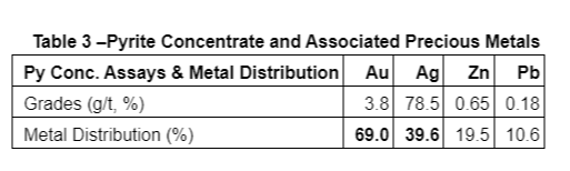 While all four methods successfully recovered precious metals within the Py concentrate, the Albion Process was selected for further test work given its high recovery rates, proven operational robustness and cost effectiveness. By fine grinding, limestone addition and oxygen injection, sulphides were oxidized at 75%. Subsequent cyanide leach results successfully leached 84.9% of the Au and 91.2% of the Ag contained in the sulphur concentrate (Table 4).
