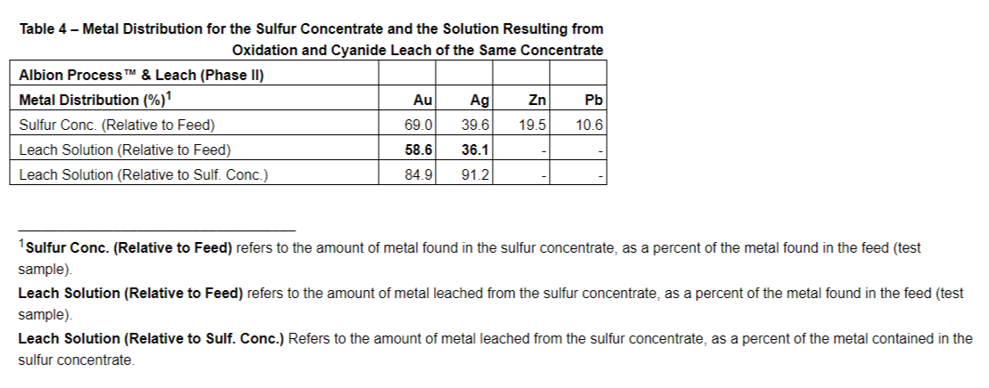 Results reported below are from a two-step process: Phase I via a flotation circuit, and Phase II processing using the Albion Process and cyanide leaching as follows: