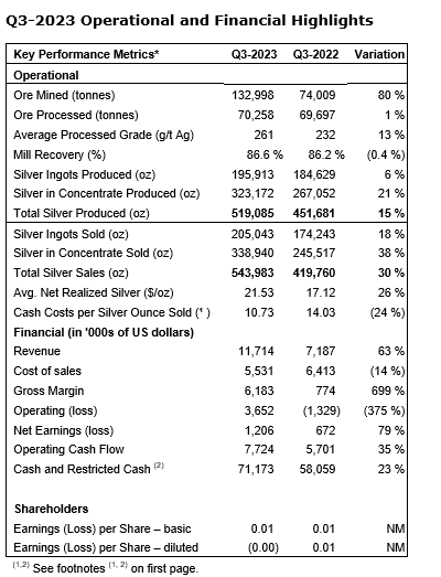 - Revenue from silver sales totaled 11.7-million (Q3 2022 -- $7.2-million) in Q3 2023, an increase of 63 per cent, representing an average realized price of $21.53 per oz (Q3 2022 -- $17.12 per oz);