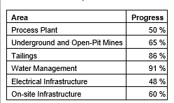 At quarter-end, construction of the tailing storage facility was progressing well and was 86 per cent complete. The two water storage basins were 100 per cent completed. Other infrastructures, such as the camp, roads, workshops and warehouses, were 55 per cent completed. Furthermore, the power line and electrical substations progressed to 48 per cent completion.