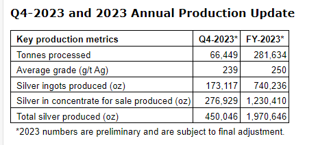 Silver production of 1,970,646 oz in 2023, a 4.8-per-cent increase compared with 2022 and beating 2023 production guidance of between 1.7 million and 1.9 million oz;
