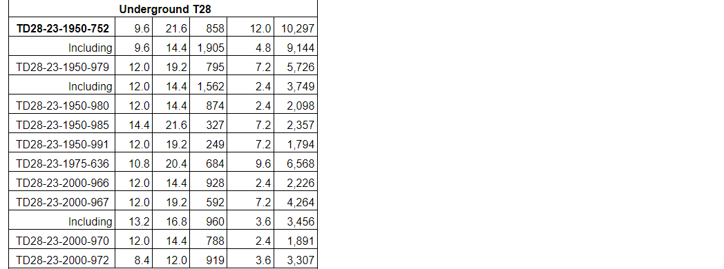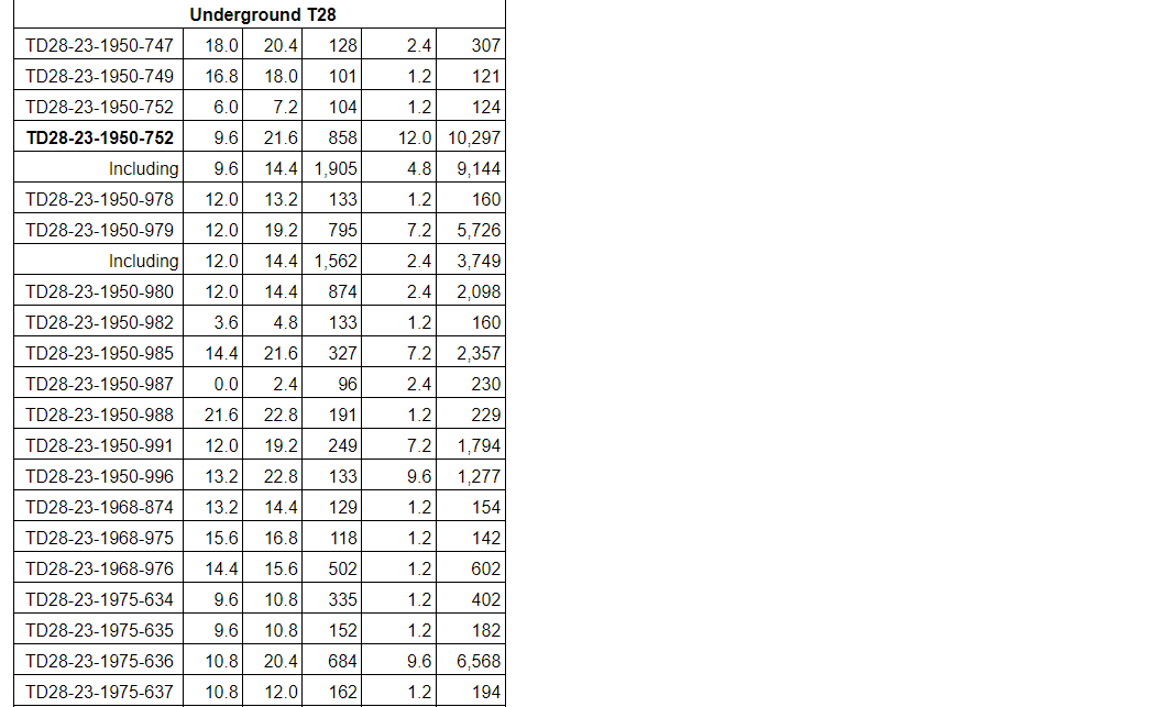 Hole TD28-23-1950-752 intercepted 858 g/t Ag over 12 m, including 1,905 g/t Ag over 4.8 m.