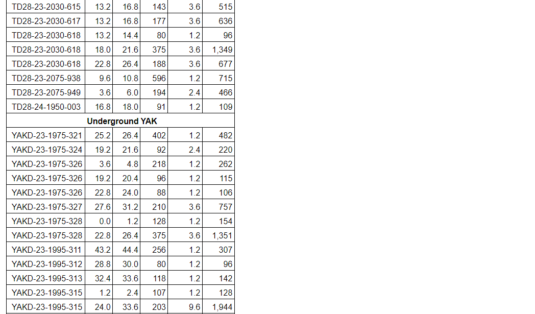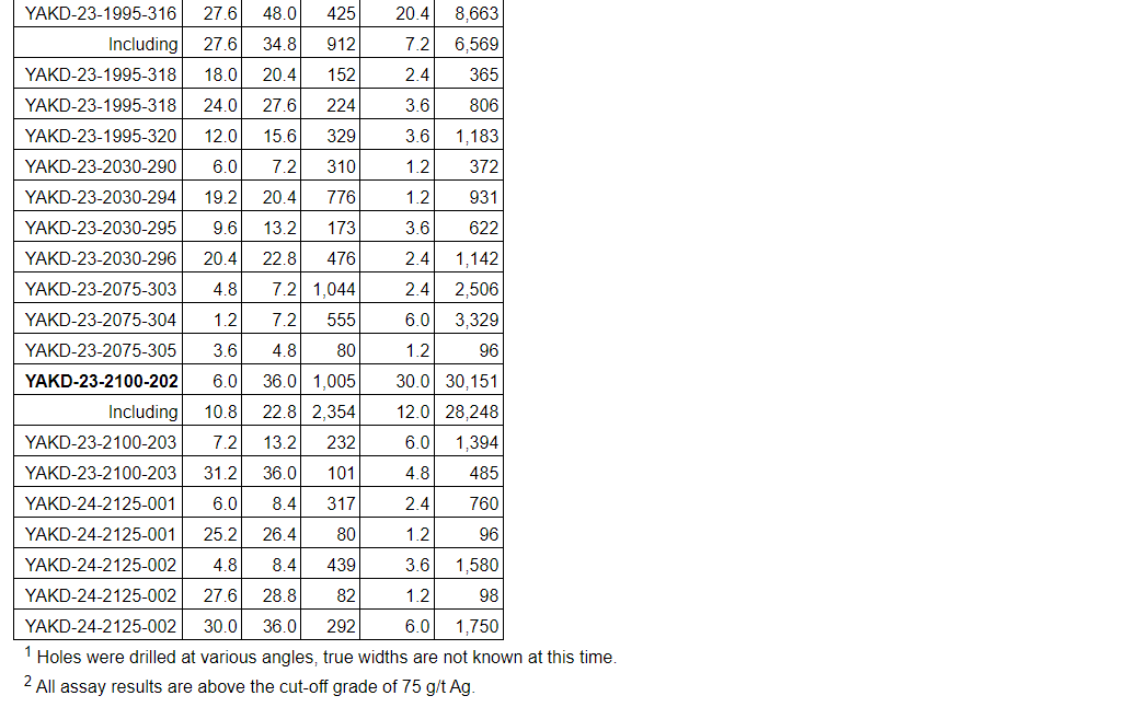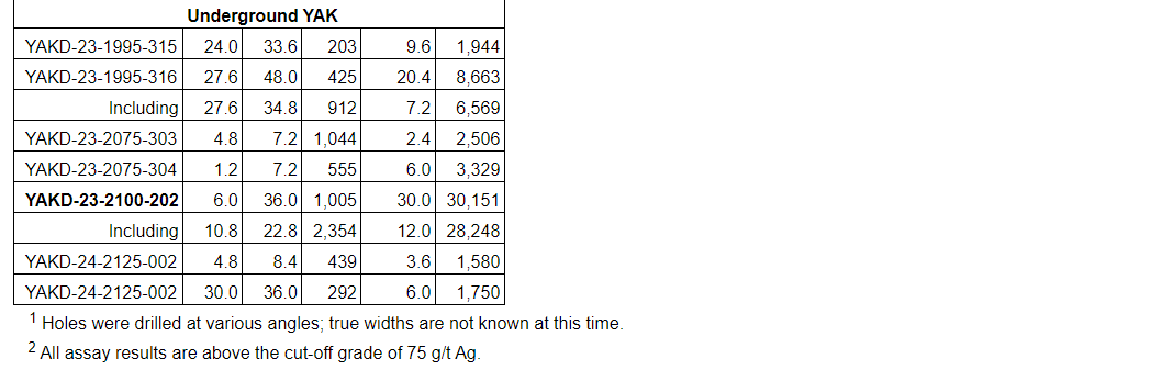 Hole YAKD-23-2100-202 intercepted 1,005 g/t Ag over 30 m, including 2,354 g/t Ag over 12 m.