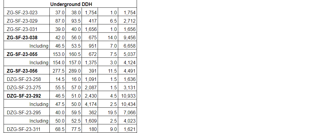 Hole ZG-SF-23-038 intercepted 675 g/t Ag over 14 m, including 951 g/t Ag over seven m.