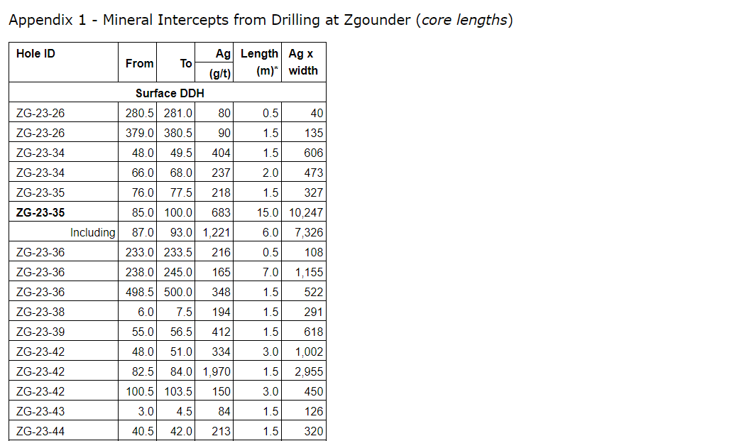 "Today's results, including holes ZG-23-54 and DZG-SF-23-292, further validate the very-high-grade nature of Zgounder, while holes ZG-SF-23-055 and ZG-SF-23-056 confirm mineralization near the granite contact," said Benoit La Salle, president and chief executive officer. "Importantly, these initial results outline significant down-plunge extensions of the deposit and continue to return thick, high-grade intercepts. Four underground rigs are now mobilized, with the objective of expanding mineral resources at depth."
