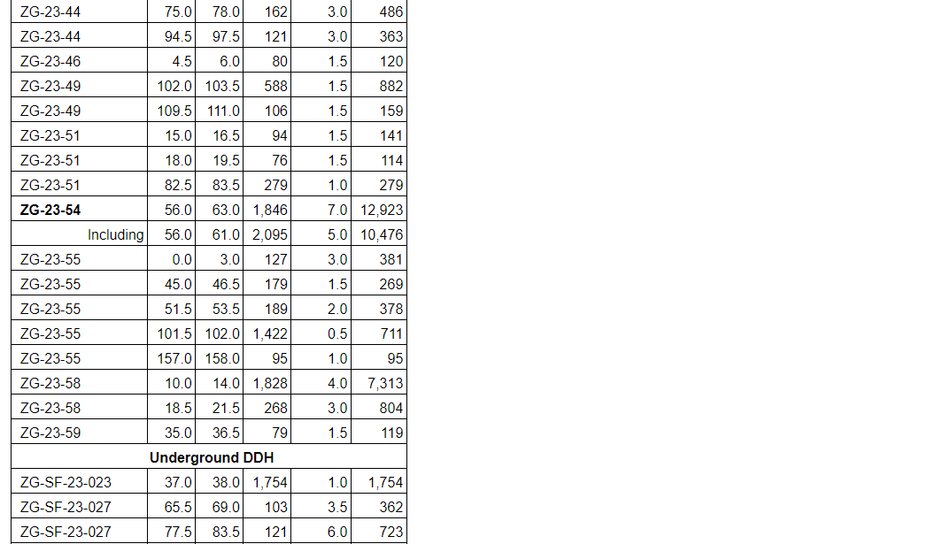 From surface, diamond drill hole ZG-23-54 intercepted 1,846 grams per tonne silver over seven metres, including five m at 2,095 g/t Ag; and ZG-23-35 intercepted 683 g/t Ag over 15 m, including six m at 1,221 g/t Ag.