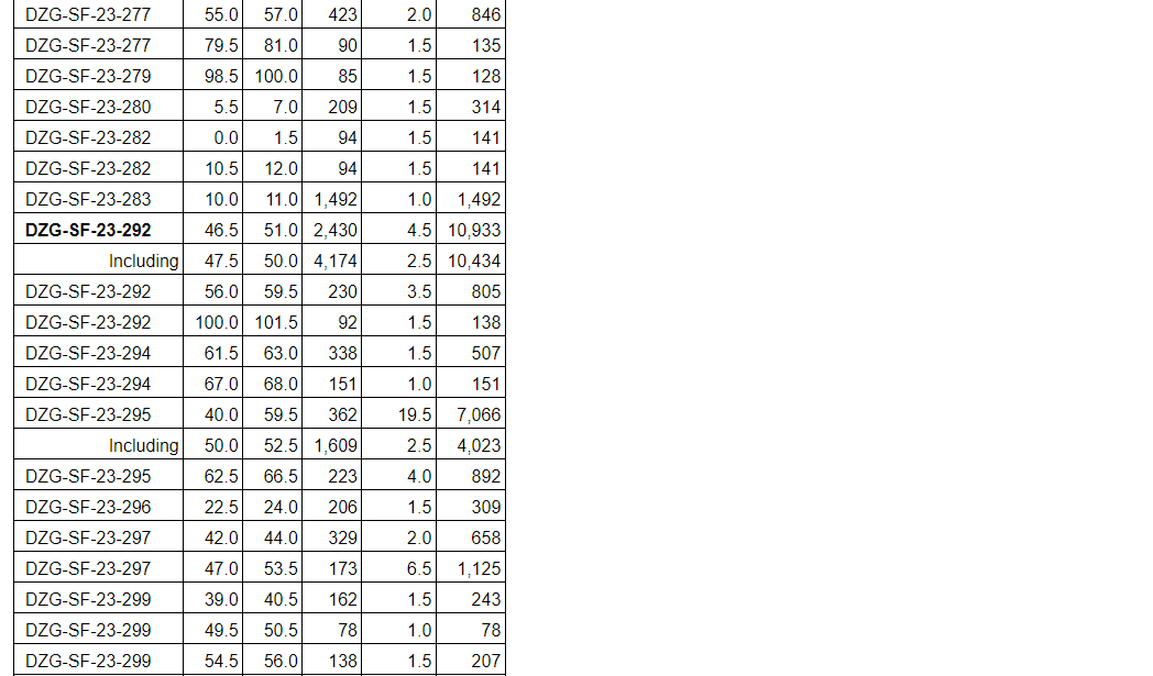 Hole DZG-SF-23-292 intercepted 2,430 g/t Ag over 4.5 m, including 4,174 g/t Ag over 2.5 m.