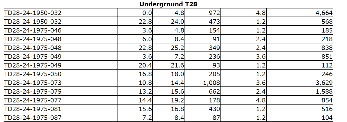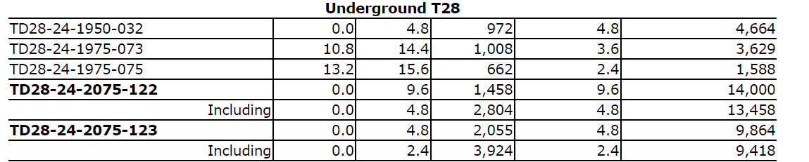- Hole T28-24-2075-123 intercepted 2,055 g/t Ag over 4.8 m, including 3,924 g/t Ag over 2.4 m.