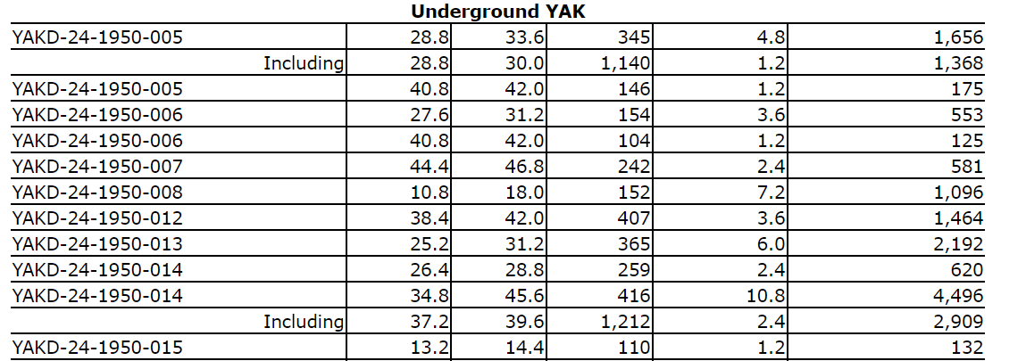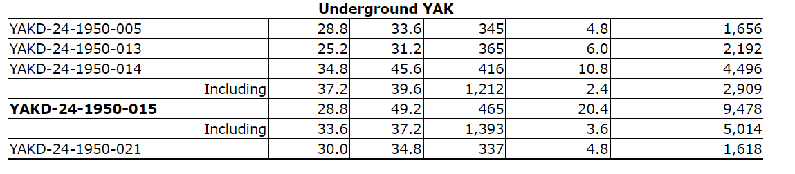Hole YAKD-24-1950-015 intercepted 465 g/t Ag over 20.4 m, including 1,393 g/t Ag over 3.6 m.