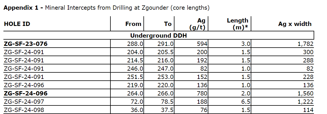 "Today's high-grade drill results, including holes DZG-SF-24-018 and DZG-SF-24-025, continue to confirm high-grade continuity of silver mineralization at Zgounder," said Benoit La Salle, president and chief executive officer. "Furthermore, we are pleased with the new silver-rich intercepts near the granite contact, demonstrating strong resource potential at depth at Zgounder. We currently have four underground rigs turning and expect more significant drill results in the coming months."