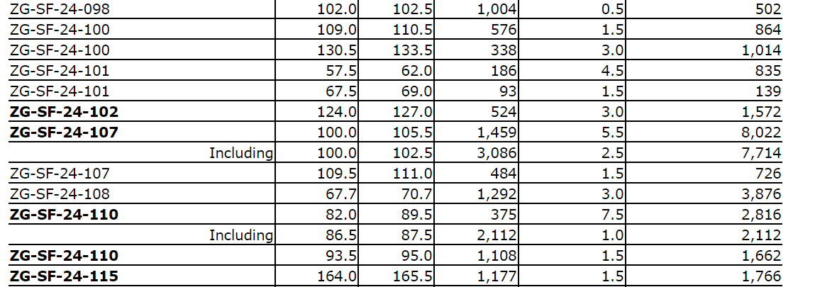- ZG-SF-24-110 intercepted 375 g/t Ag over 7.5 m and 1,108 g/t Ag over 1.5 m.