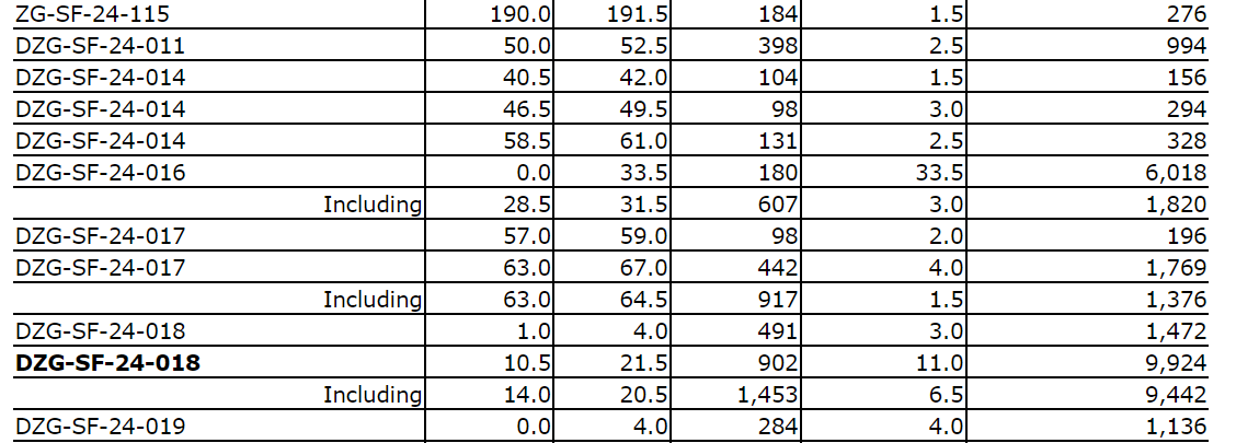 Hole DZG-SF-24-018 intercepted 902 g/t Ag over 11.0 m, including 1,453 g/t Ag over 6.5 m.