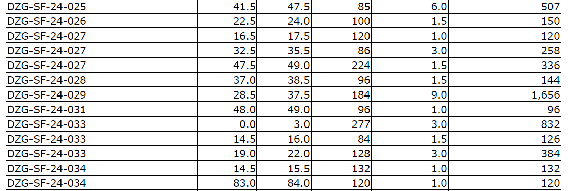 - Hole DZG-SF-24-025 intercepted 1,548 g/t Ag over 4.0 m, including 5,794 g/t Ag over 1.0 m.