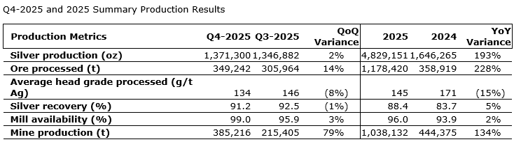 "Zgounder delivered another strong quarter, with solid Q4 production, recoveries, mining rate and throughput" said Benoit La Salle, president and chief executive officer. "The team's efforts throughout 2025 culminated in a record December, with a milling and mining rate of 4,107 tpd and 4,652 tpd, respectively, and an all-time high silver production of 545,491 oz. We also published a new mine plan aligned with the current silver price environment, positioning Zgounder to maximize cash flow. With the 2025 ramp-up complete, our focus now shifts to disciplined execution, continuous optimization, and consistent delivery into 2026 and beyond."