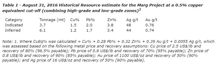 The most recent NI 43-101 Mineral Resource estimate for the Marg Project (see Table 1 below) was completed by Mining Plus Canada Consulting Ltd. in 2016 and incorporated into a Preliminary Economic Assessment ("PEA") for the project (note: the PEA title is "Revere Development Corp, Marg Project Preliminary Economic Assessment, Technical Report, Yukon Canada" and is dated August 31, 2016).