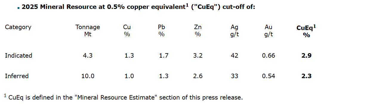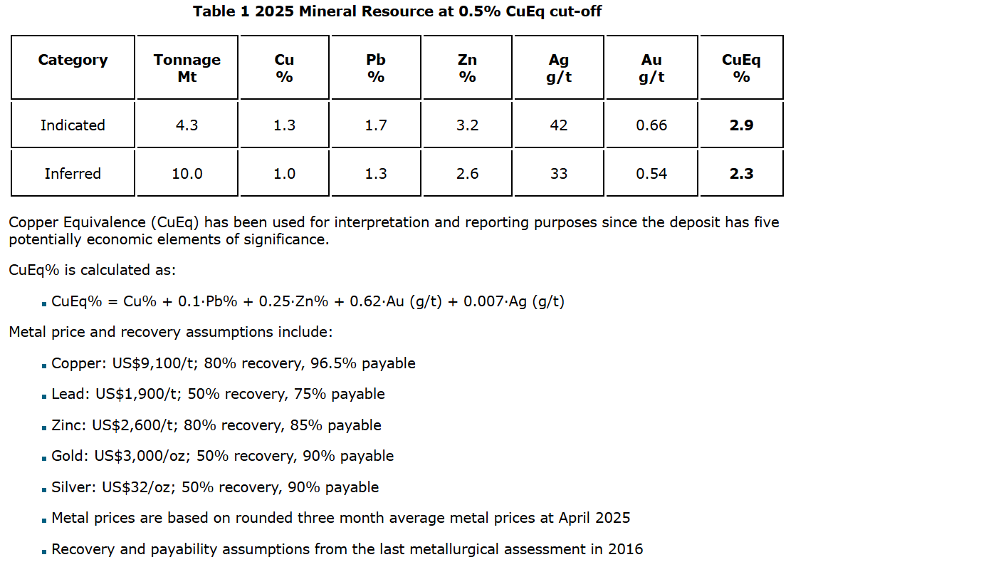 The 2025 mineral resource builds upon the historic mineral resource model, extending the interpreted mineralized domain extent using a 0.5 per cent CuEq (copper equivalent) cut-off grade and simplifying the structural model by removing the previous use of dual cut-offs.