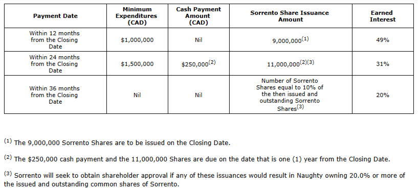 Pursuant to the terms of the option agreement, Naughty Ventures has granted an option to Sorrento to acquire up to 100 per cent of Naughty Ventures' right, title and interest in and to the mineral claims comprising the Bottom Brook property. The option can be exercised by Sorrento on or prior to the third anniversary of the option agreement by making the cash payments, issuances of common shares in the capital of Sorrento and incurring the exploration expenditures on or before the dates indicated in the table below. The date of closing will be such date that is mutually agreed to by Naughty Ventures and Sorrento after satisfaction or waiver of all the conditions set forth in the option agreement.