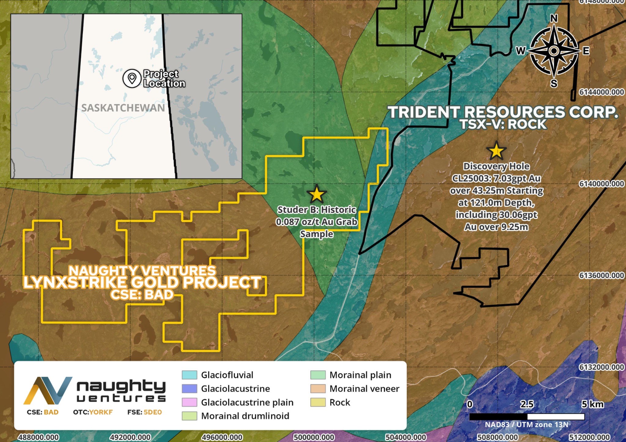 Vancouver, British Columbia--(Newsfile Corp. - December 11, 2025) - Naughty Ventures Corp. (CSE: BAD) (OTC Pink: YORKF) (FSE: 5DE0) ("Naughty Ventures" or the "Company") is pleased to announce that it has staked a strategic 5,300-hectare land package, hereinafter referred to as the LYNXSTRIKE Gold Project, directly adjoining Trident Resources Corp.'s ("Trident") emerging high-grade Contact Lake Gold Discovery in the La Ronge Gold Belt of Saskatchewan.
