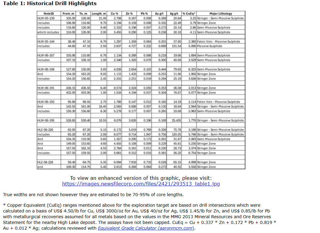 Drilling intersected zones of stringer to massive sulphide mineralization hosted within felsic volcanic rocks, along with strong chlorite and sericite alteration, typical of VMS feeder zones. The mineralized horizon is interpreted to extend for approximately 530 metres along strike with a mean true thickness of approximately six metres. Sulphide lenses associated with other deposits in the High Lake greenstone belt commonly form steep-west-dipping bodies. The West zone lens of the High Lake deposit, reaches 275 metres in strike length, extending about 900 metres down dip and is up to 40 metres thick. Reported copper grades from historical drilling within the Sand Lake sulphide zone range between 1.5 per cent and 5.7 per cent Cu, with associated zinc and precious metals (see Table 1).