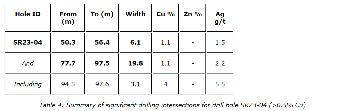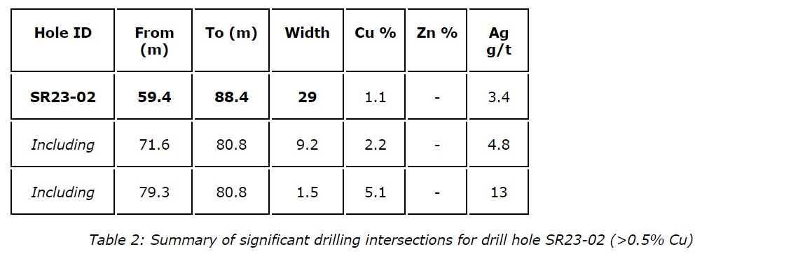 Assay results from drill holes SR23-02, SR23-03, SR23-04, SR23-05 and SR23-06 have been received and confirm thick intervals of near-surface copper sulphides within the 4100N zone.