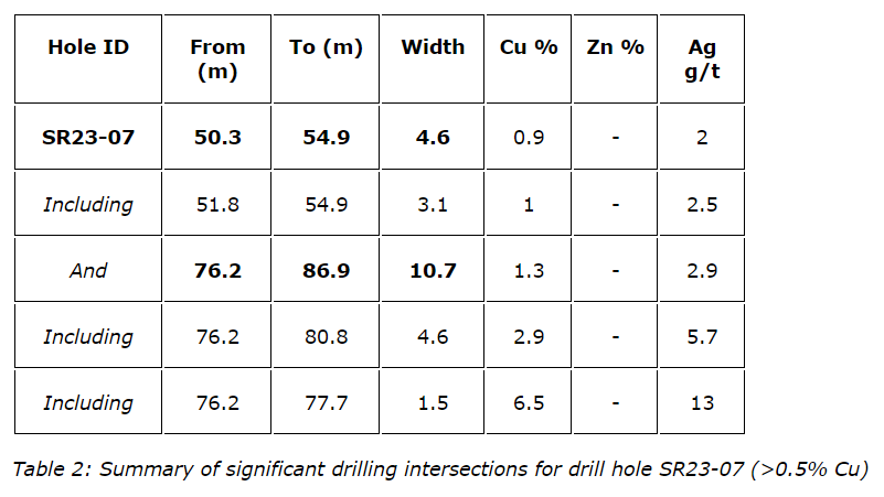 - Drill hole SR23-07 has intersected:10.7m @ 1.3 per cent copper from 76.2m,